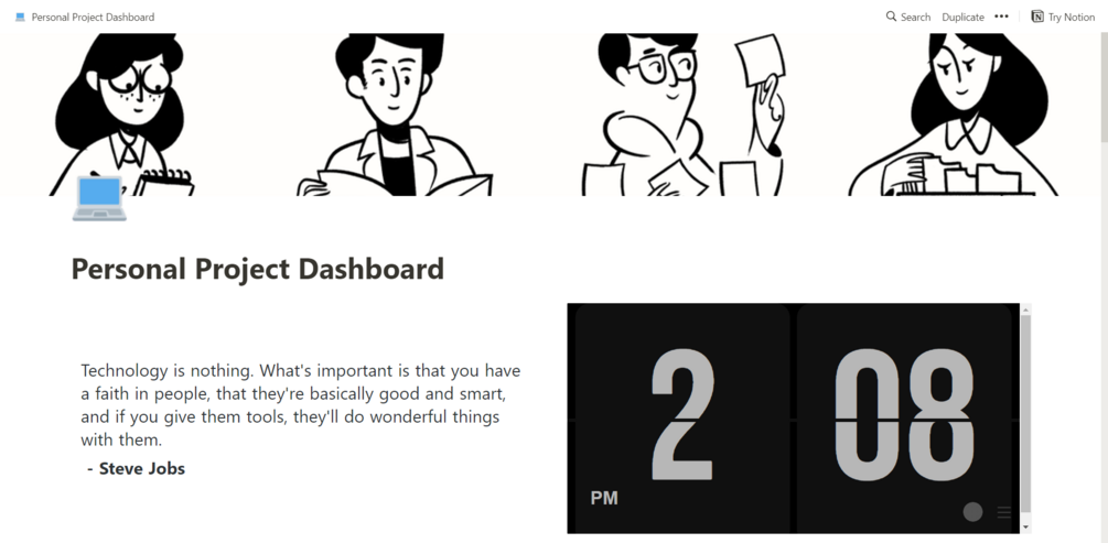 The Personal Project Dashboard is a template for organizing and tracking the progress of a personal project. It can be used to help break down a large project into smaller tasks, set deadlines, and keep track of progress. The template includes sections for a to-do list, a schedule, a notes section, and a progress tracker. It can be customized to fit the needs of a specific project and is a useful tool for anyone looking to improve their productivity and stay on track with their personal projects.